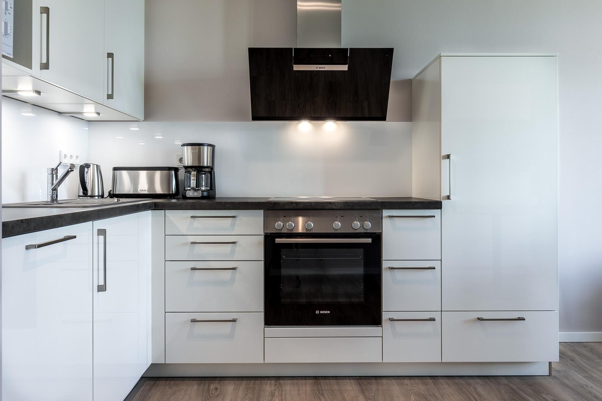 Zur Ausstattung der Ferienanlage gehören außerdem eine Rezeption mit Lobby und Kamin-Lounge, eine Tiefgarage mit inkludiertem Stellplatz (max. Höhe 2 m) sowie gemeinschaftlich nutzbare Waschräume auf jeder Etage. Zwei Aufzüge sorgen für barrierefreien Zugang zu allen Apartments. Fahrräder lassen sich sicher im abschließbaren Kellerraum unterbringen, und vor dem Haus steht eine öffentliche Ladestation für E-Autos zur Verfügung, die gegen Gebühr genutzt werden kann.