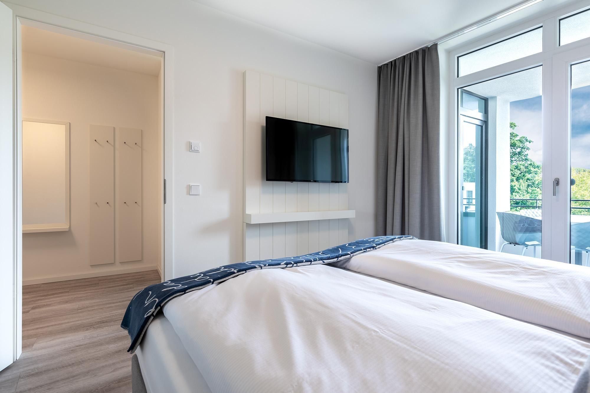 Das Apartment überzeugt durch elegante Gestaltung und hochwertige Materialien. Fußbodenheizung, bodentiefe Fenster mit Sonnenschutzverglasung und kostenfreies WLAN sorgen für hohen Wohnkomfort. Der Wohnbereich mit Doppelschlafcouch (1,40 × 2,00 m) und großem Flatscreen-TV sowie das separate Schlafzimmer mit Boxspringbett (1,80 × 2,00 m) und Flatscreen-TV schaffen ein behagliches Ambiente.