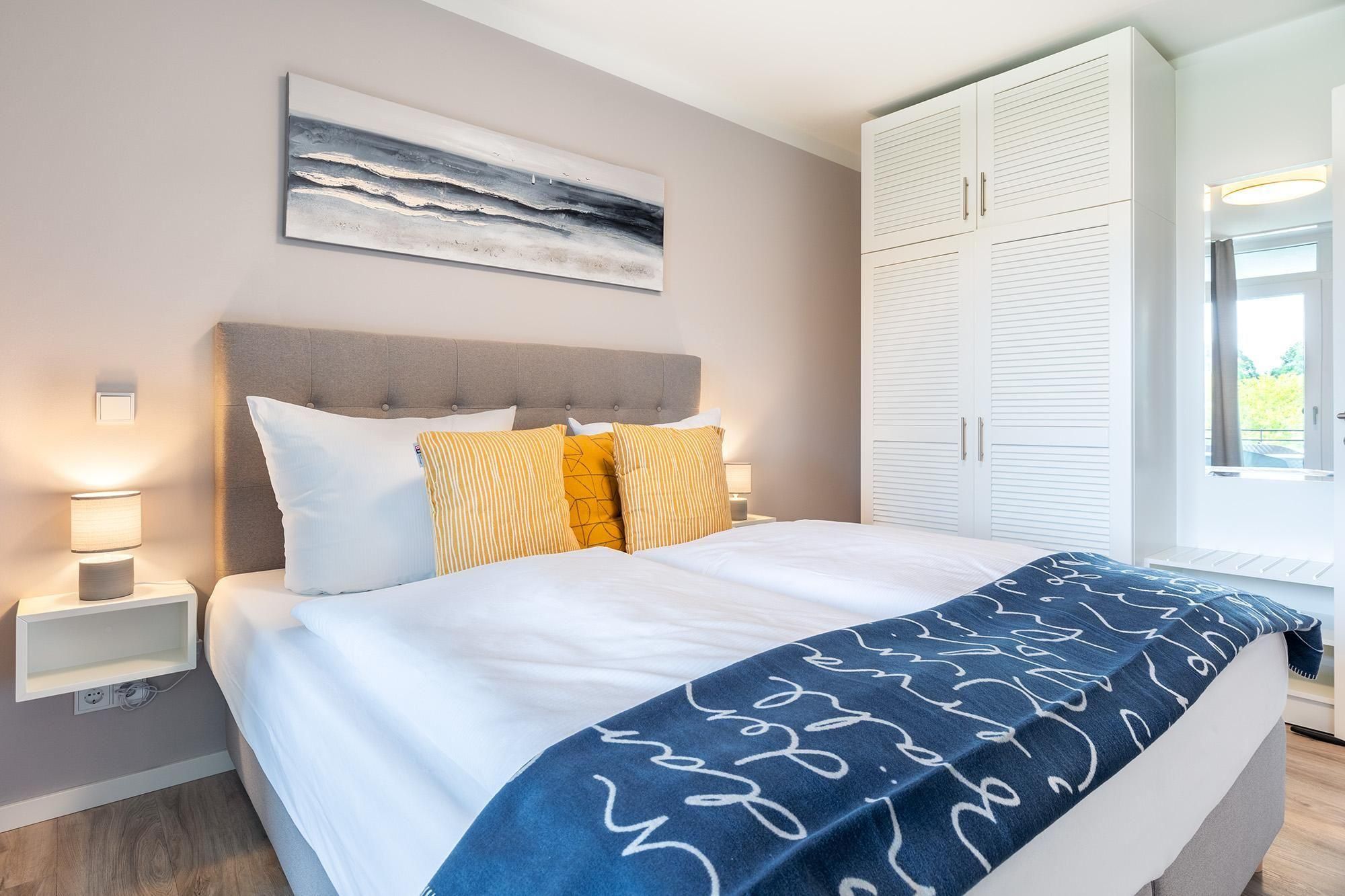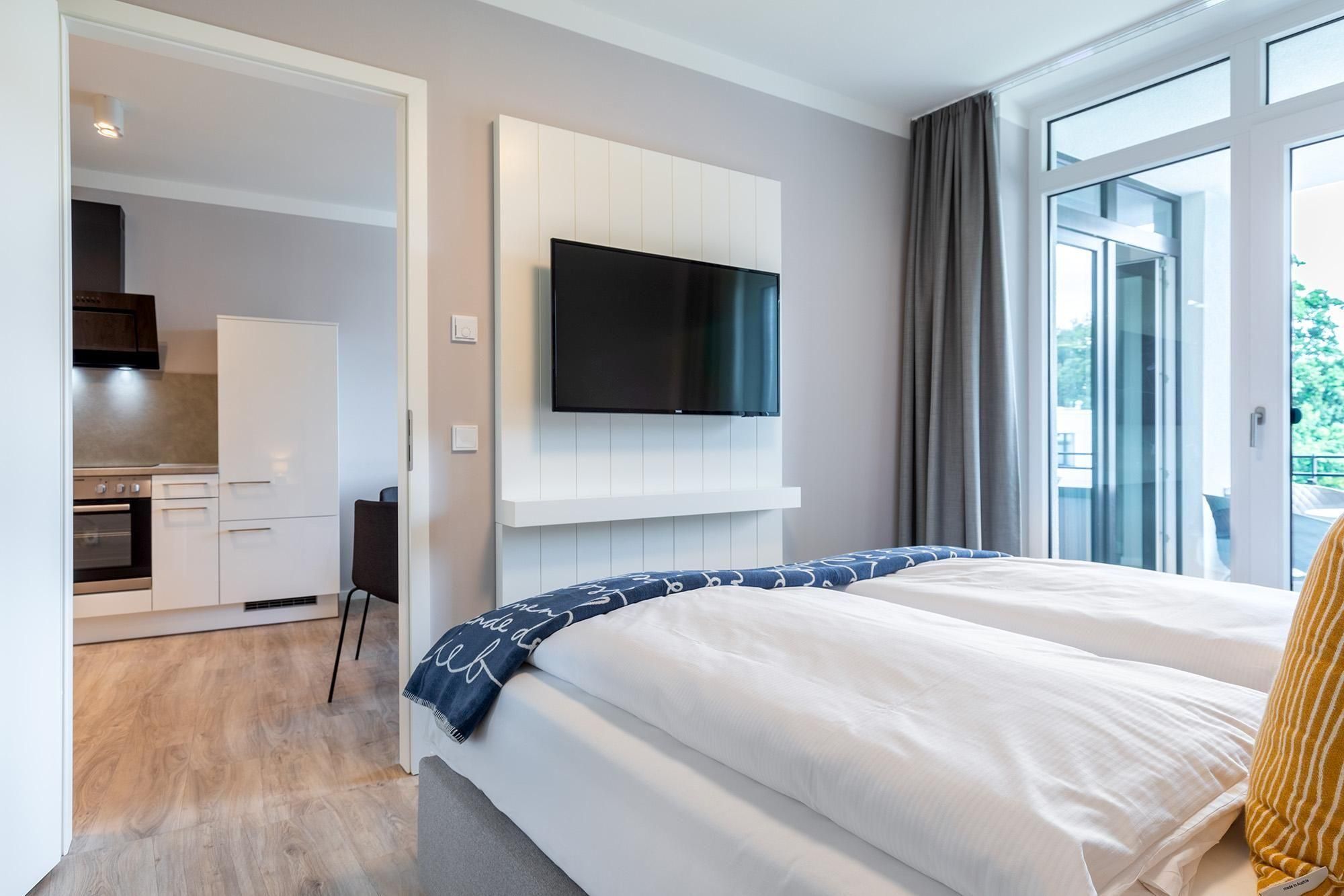 Im separaten Schlafzimmer erwartet Sie ein hochwertiges Boxspringbett für erholsame Nächte sowie ein weiterer SMART-TV. Das stilvoll eingerichtete Badezimmer bietet eine ebenerdige Regendusche, ein WC, einen Kosmetikspiegel, Handtuchheizkörper, Föhn und natürlich Fußbodenheizung.