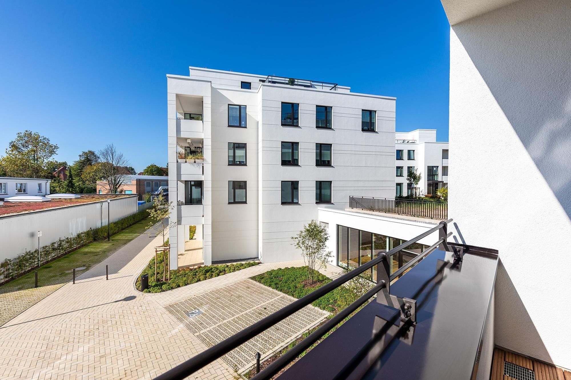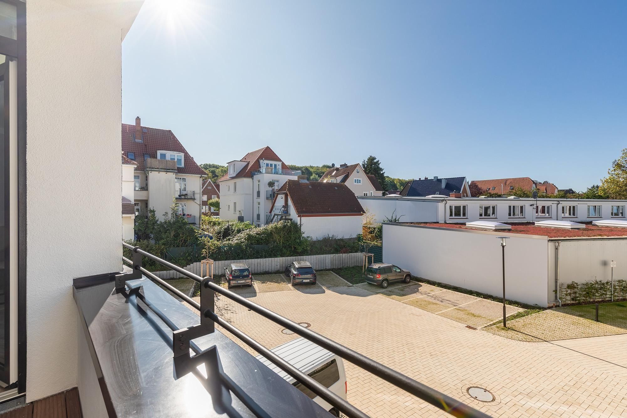 Zur Ausstattung der Ferienanlage gehören außerdem eine Rezeption mit Lobby und Kamin-Lounge, eine Tiefgarage mit inkludiertem Stellplatz (max. Höhe 2 m) sowie gemeinschaftlich nutzbare Waschräume auf jeder Etage. Zwei Aufzüge sorgen für barrierefreien Zugang zu allen Apartments. Fahrräder lassen sich sicher im abschließbaren Kellerraum unterbringen, und vor dem Haus steht eine öffentliche Ladestation für E-Autos zur Verfügung, die gegen Gebühr genutzt werden kann.