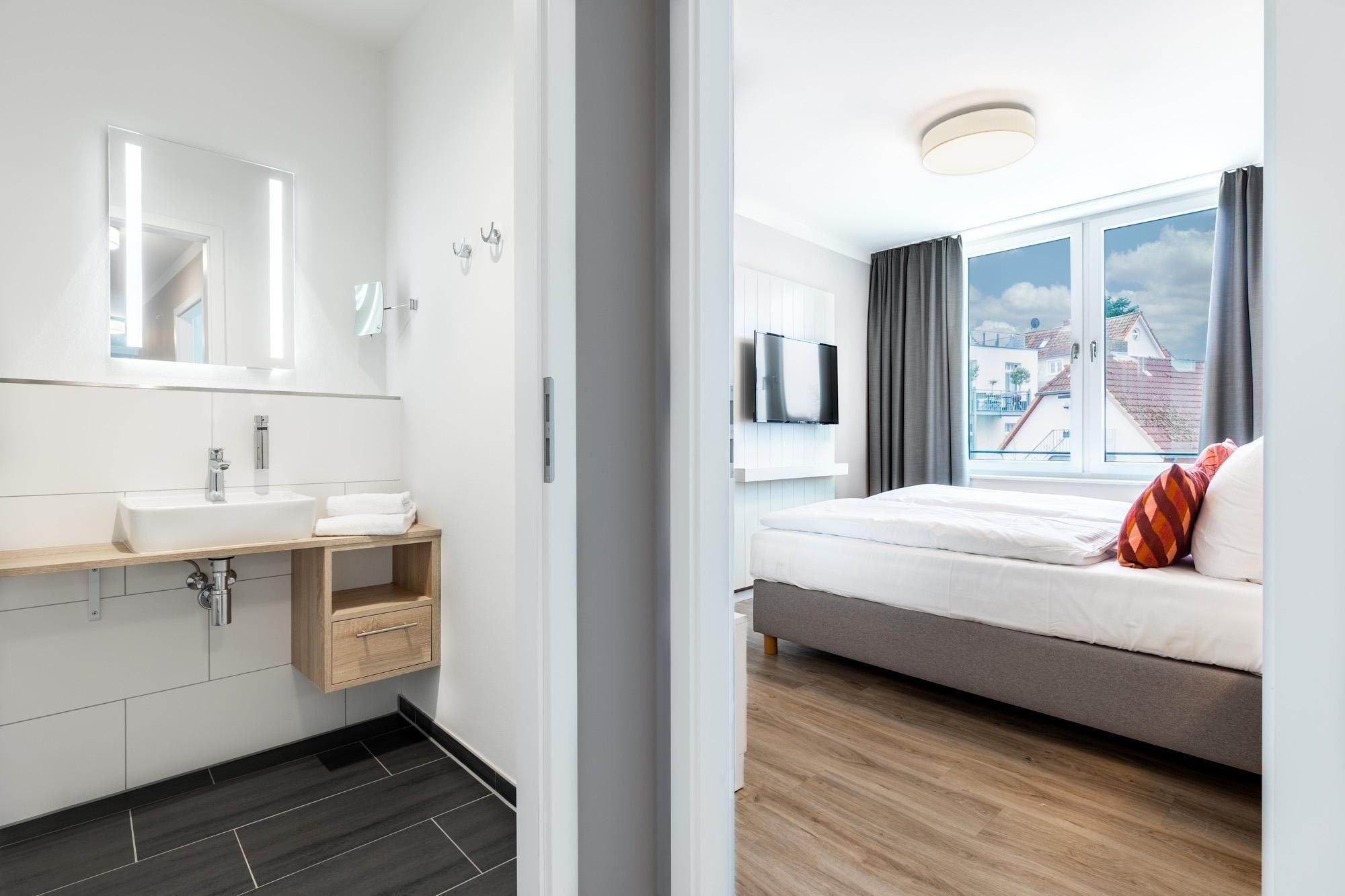 Das Badezimmer ist mit einer bodengleichen Dusche, WC, Waschbecken, Kosmetikspiegel und Haartrockner modern ausgestattet und sorgt für einen komfortablen Start in den Tag.