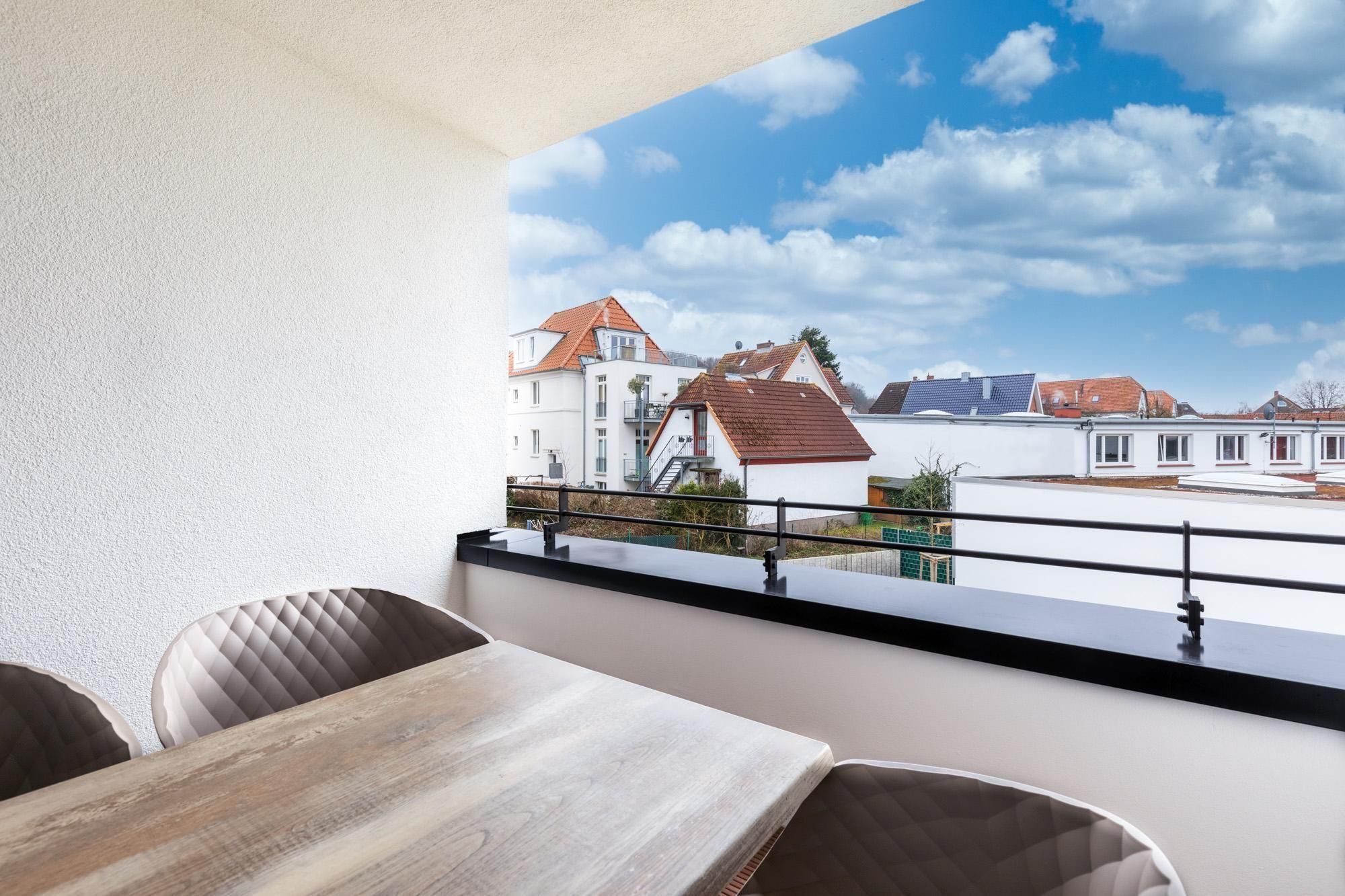 Im Apartment stehen zwei Zimmer zur Verfügung: ein gemütliches Schlafzimmer für erholsame Nächte sowie ein moderner Wohnbereich mit offen gestalteter Küche. Insgesamt finden bis zu fünf Personen dank komfortabler Schlafmöglichkeiten Platz. Der Wohnbereich ist mit einem großen TV und kostenfreiem WLAN ausgestattet und bietet somit beste Voraussetzungen für gesellige Abende oder entspannte Stunden nach einem Tag an der Ostsee. Eine zusätzliche Besonderheit ist der überdachte Balkon, der mit Gartenmöbeln zum Verweilen einlädt und einen angenehmen Ausblick ins Grüne gewährt.