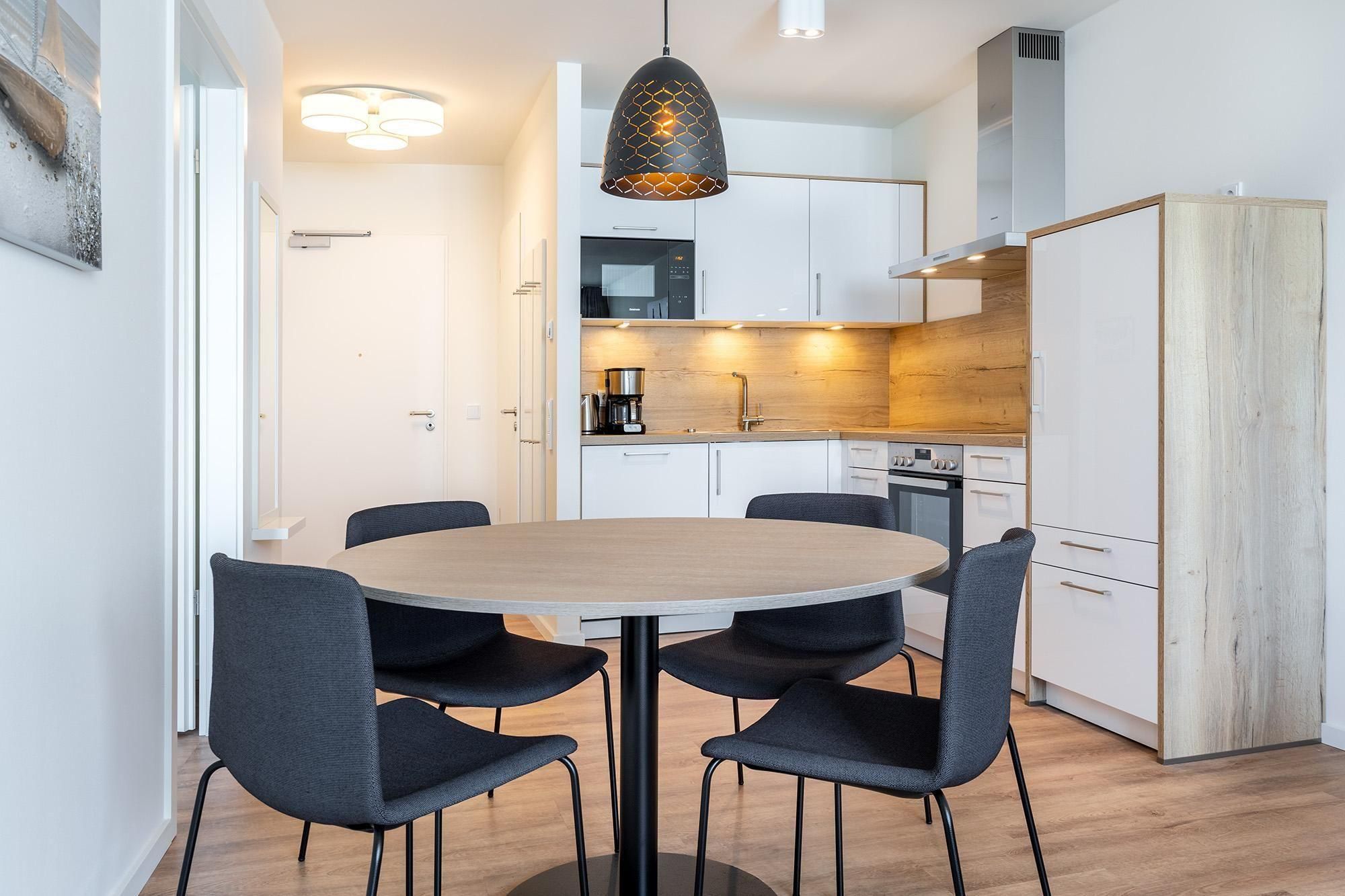 Die voll ausgestattete, offene Küche lässt keine Wünsche offen: Geschirrspüler, Kühlschrank mit Gefrierfach, Mikrowelle, Kaffeemaschine, Toaster, Wasserkocher, Eierkocher, Glaskeramikkochfeld und Backofen stehen Ihnen für eine flexible Selbstverpflegung zur Verfügung. Der angrenzende Wohn-Essbereich ist mit einer bequemen Doppelschlafcouch sowie einem großen SMART-TV ausgestattet – perfekt für entspannte Abende nach einem Tag am Meer.