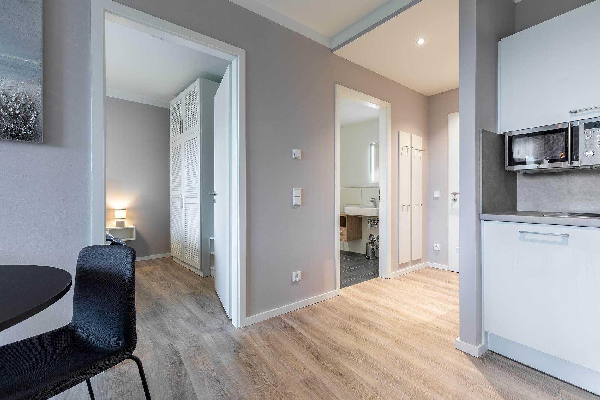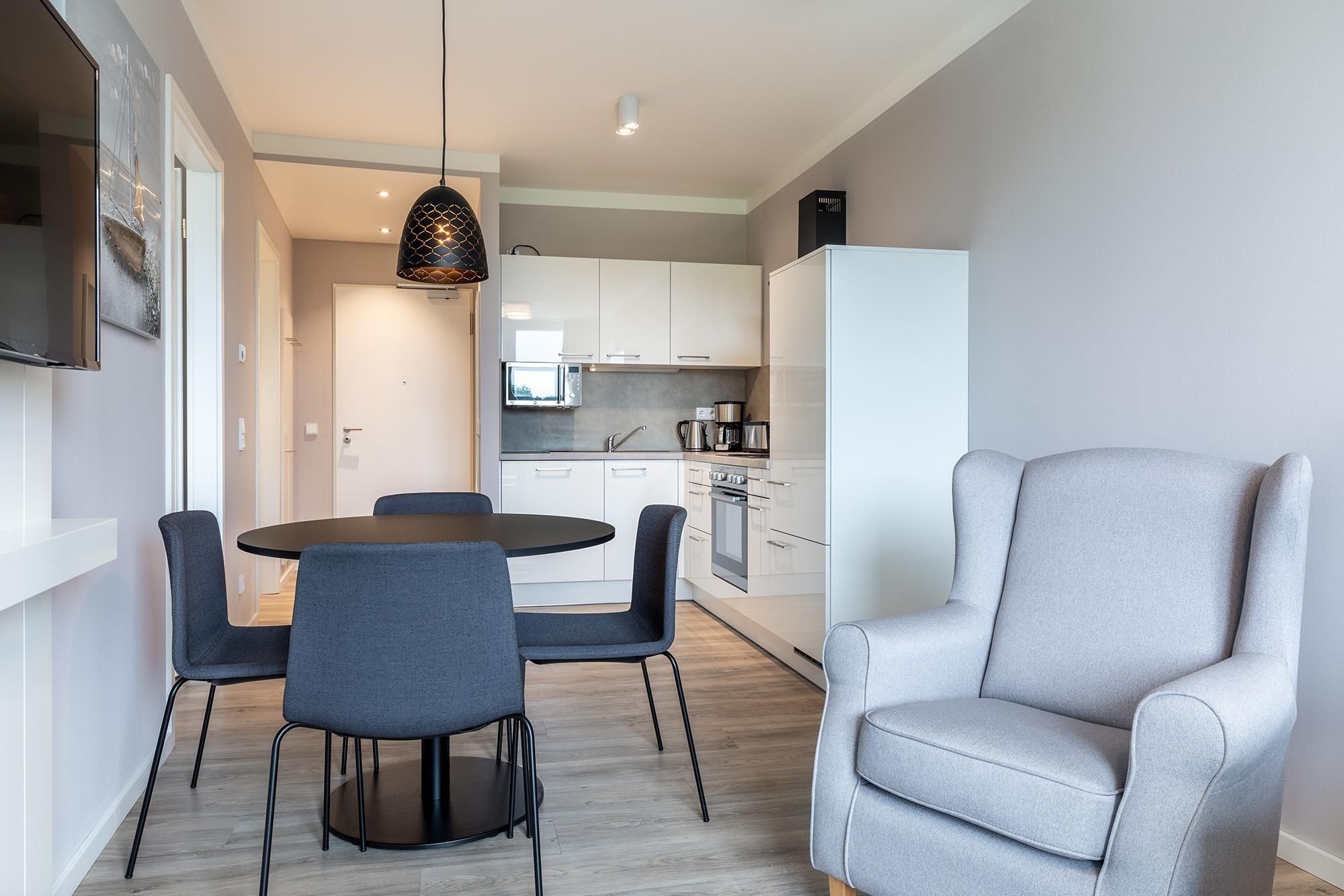 Das helle Nichtraucher-Apartment ist geschmackvoll eingerichtet und bietet Ihnen angenehme Fußbodenheizung, sonnenschutzverglaste, teilweise bodentiefe Fenster, kostenfreies WLAN sowie eine moderne, komplett ausgestattete offene Küche. Ob Geschirrspüler, Kühl-Gefrierkombination, Kaffeemaschine, Eierkocher, Toaster, Wasserkocher, Mikrowelle, Glaskeramikkochfeld oder Backofen – hier finden Sie alles, was Sie für Ihren Aufenthalt benötigen.