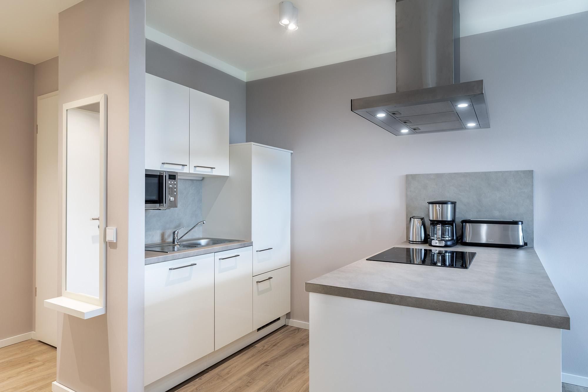 Zur Ausstattung der Ferienanlage gehören außerdem eine Rezeption mit Lobby und Kamin-Lounge, eine Tiefgarage mit inkludiertem Stellplatz (max. Höhe 2 m) sowie gemeinschaftlich nutzbare Waschräume auf jeder Etage. Zwei Aufzüge sorgen für barrierefreien Zugang zu allen Apartments. Fahrräder lassen sich sicher im abschließbaren Kellerraum unterbringen, und vor dem Haus steht eine öffentliche Ladestation für E-Autos zur Verfügung, die gegen Gebühr genutzt werden kann.