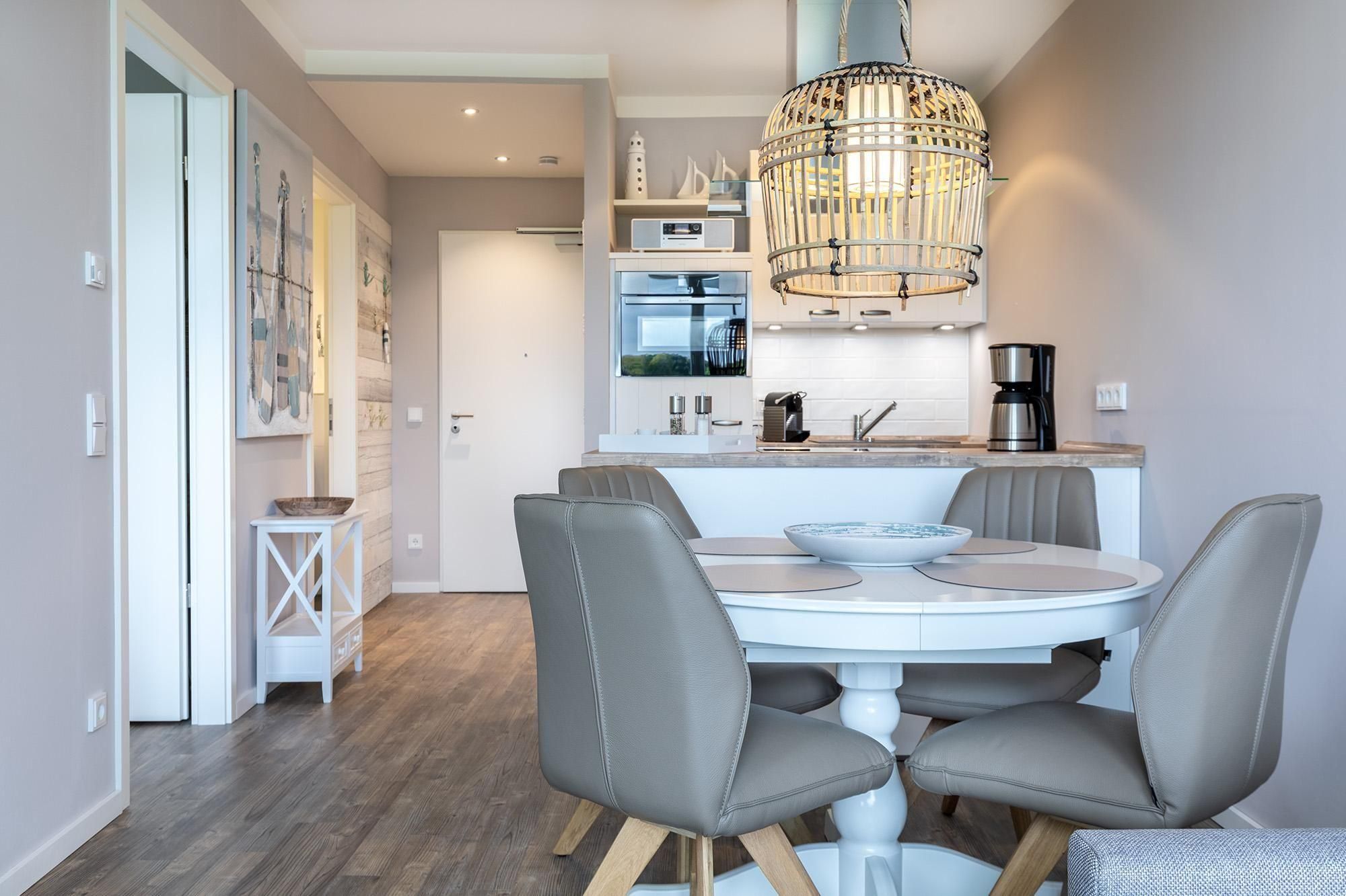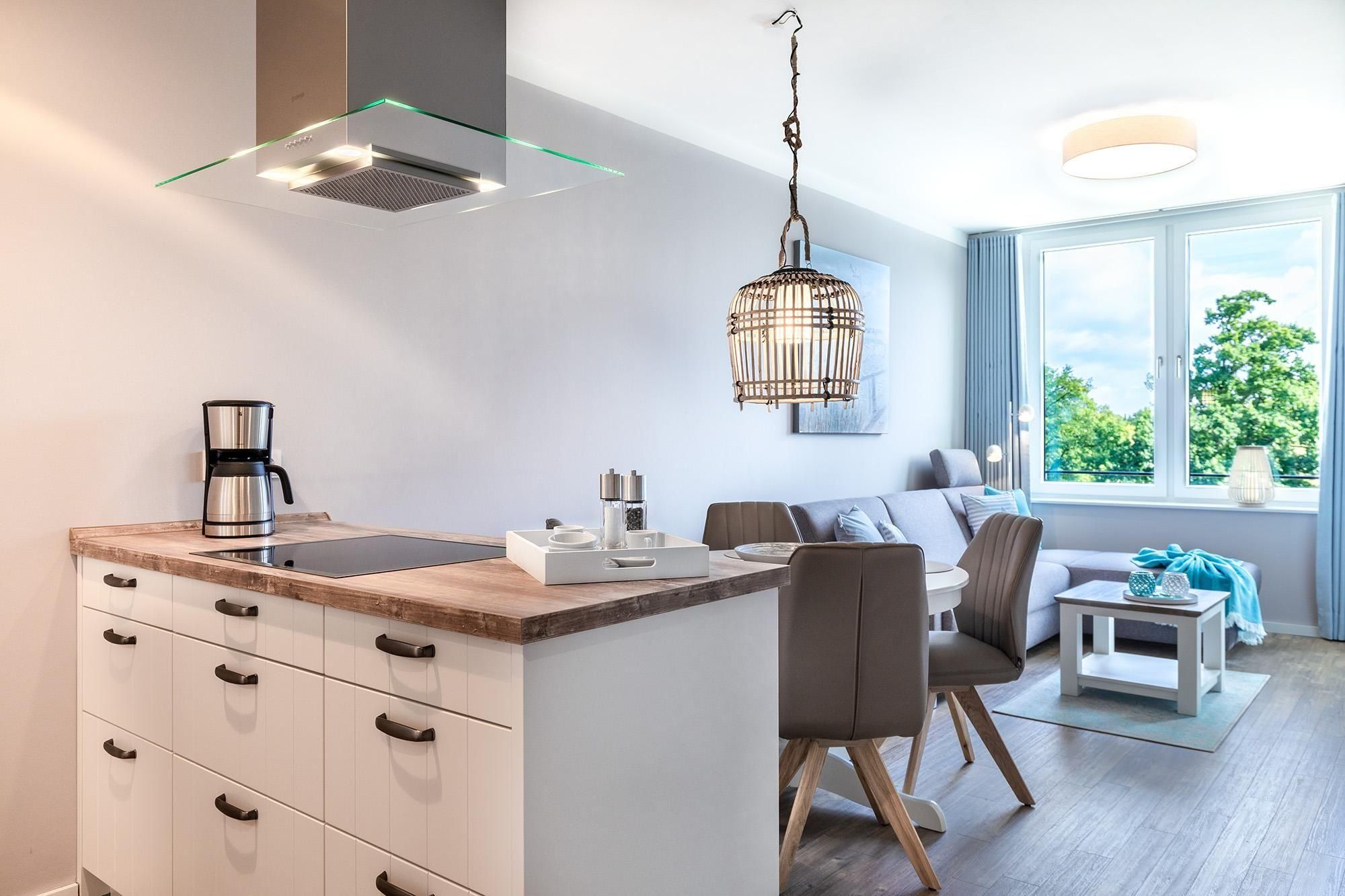 Die offene Küche mit praktischem Kochtresen ist komplett ausgestattet: Geschirrspüler, Kühl-Gefrierkombination, Kaffeemaschine sowie eine Nespresso PIXI-Kapselmaschine, Eierkocher, Toaster und Wasserkocher gehören ebenso dazu wie ein Glaskeramikkochfeld und ein Backofen mit integrierter Mikrowellenfunktion. Hier bereiten Sie mühelos Ihre Lieblingsgerichte zu und genießen diese im behaglichen Wohn-Essbereich.