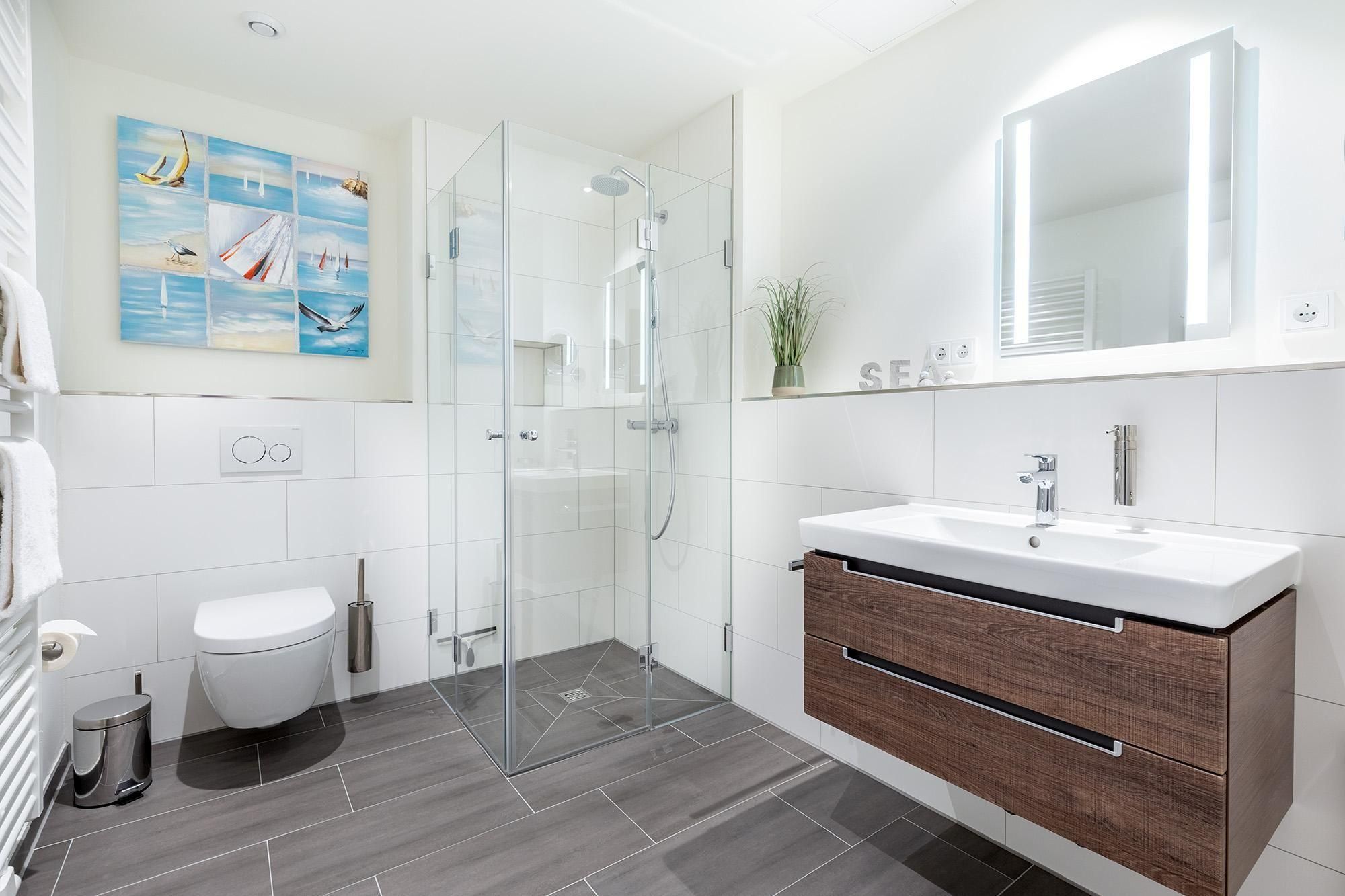 Das stilvolle Badezimmer ist mit einer ebenerdigen Dusche, WC, Waschtisch, Föhn, Kosmetikspiegel, Handtuchheizkörper und Fußbodenheizung ausgestattet – hier starten Sie angenehm frisch in den Tag.